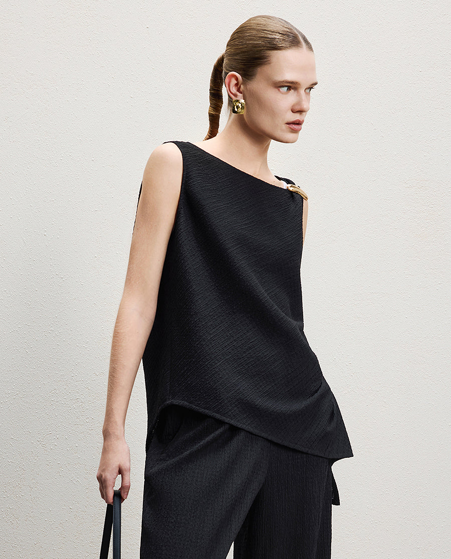 Asymmetrical draped design creates a modern, effortless silhouette. Side slit opening adds movement and versatility to your wardrobe. Crafted from soft cotton for all-day comfort. Pair with matching trousers from the same collection for a coordinated, polished look.