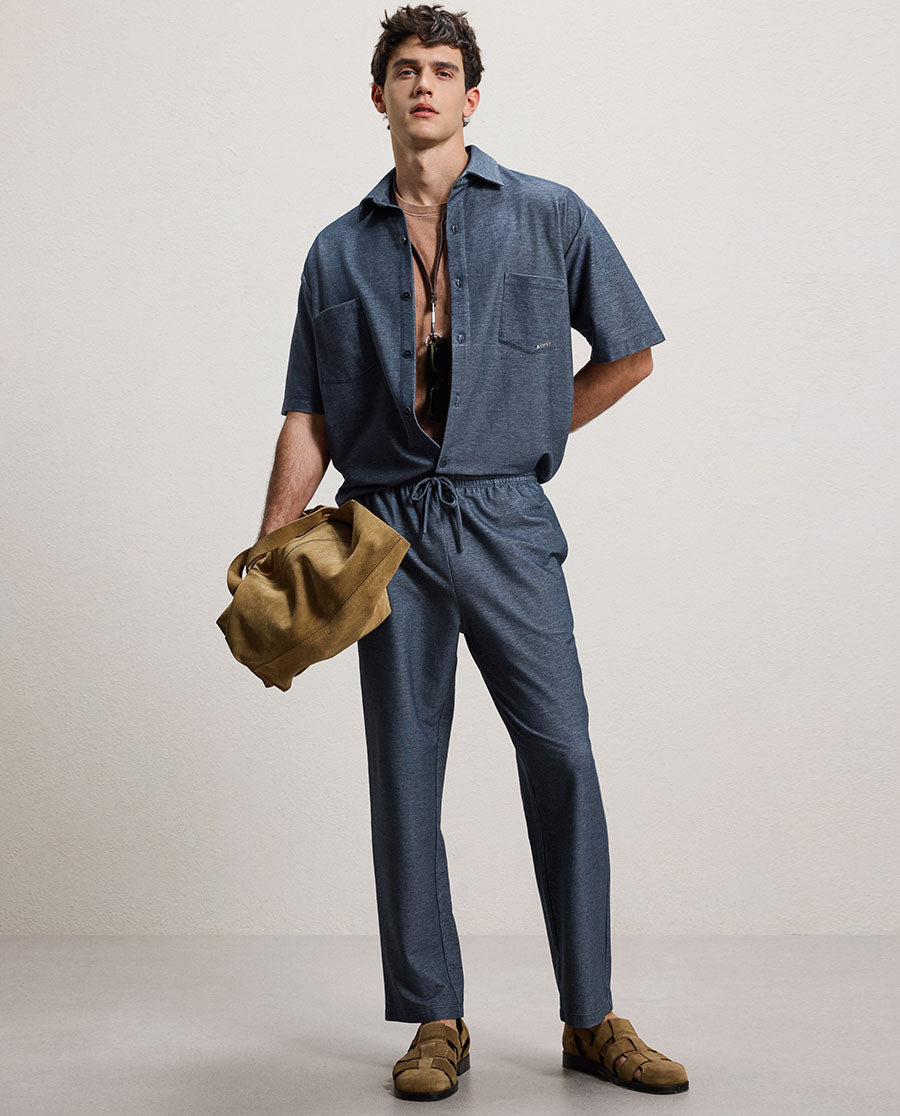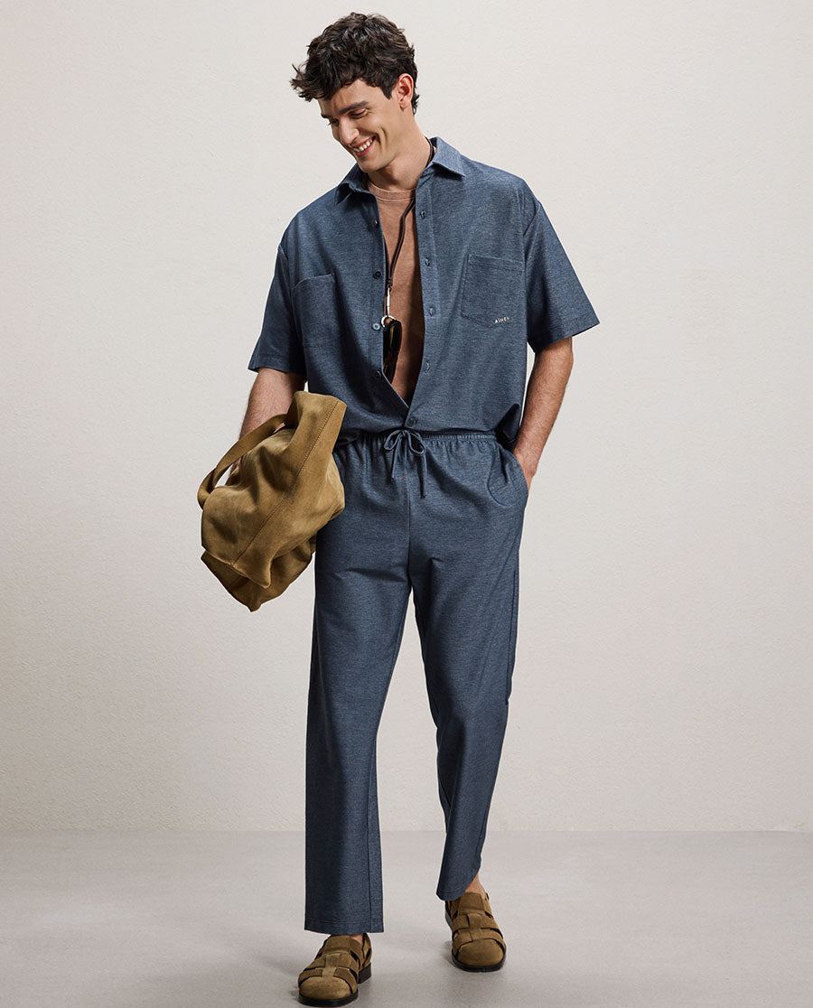 Crafted from pure cotton knit fabric with a denim-inspired twill finish, this loungewear set delivers a structured silhouette with exceptional softness. The cardigan top pairs seamlessly with matching pants for effortless comfort and style. Perfect for relaxed days at home or casual outings, the breathable cotton construction ensures all-day wearability while maintaining a polished appearance.
