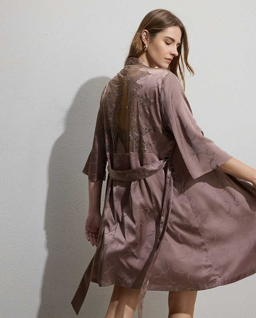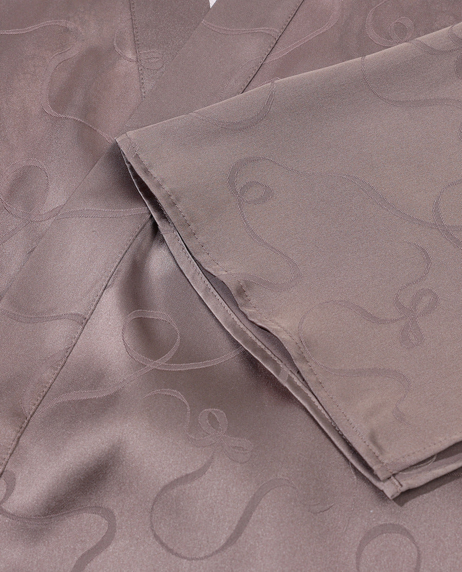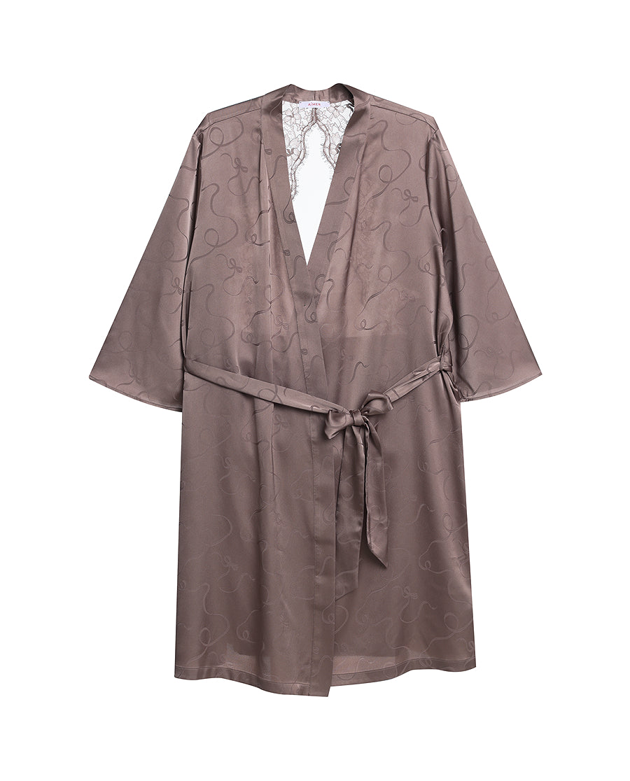 Embrace effortless elegance with this luxurious lounge robe, where a delicate bow detail becomes the focal point of understated sophistication. Crafted from lustrous satin fabric, the relaxed silhouette drapes gracefully without clinging to the body, creating a fluid, flattering line. The three-quarter sleeves offer the perfect balance between coverage and ease, while the refined bow accent adds a touch of feminine charm. Ideal for leisurely mornings or quiet evenings at home, this piece transforms loungewear into a statement of graceful style.