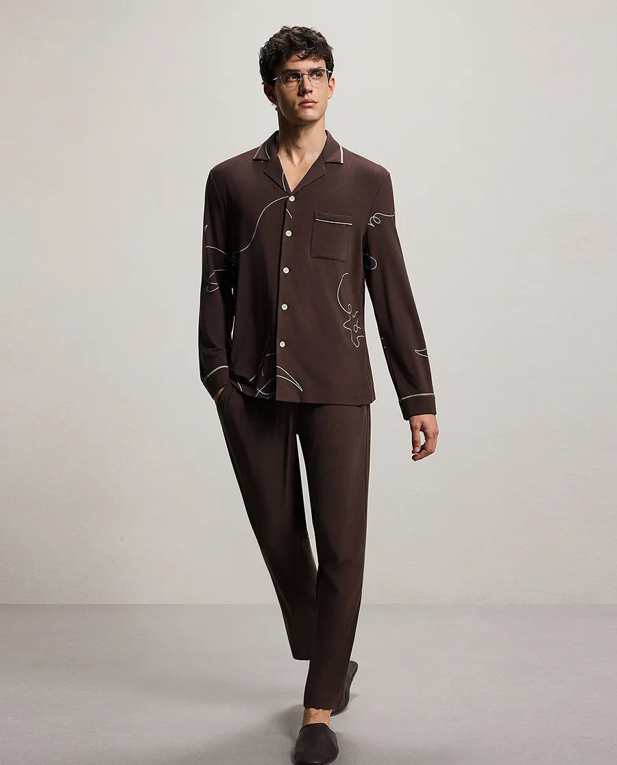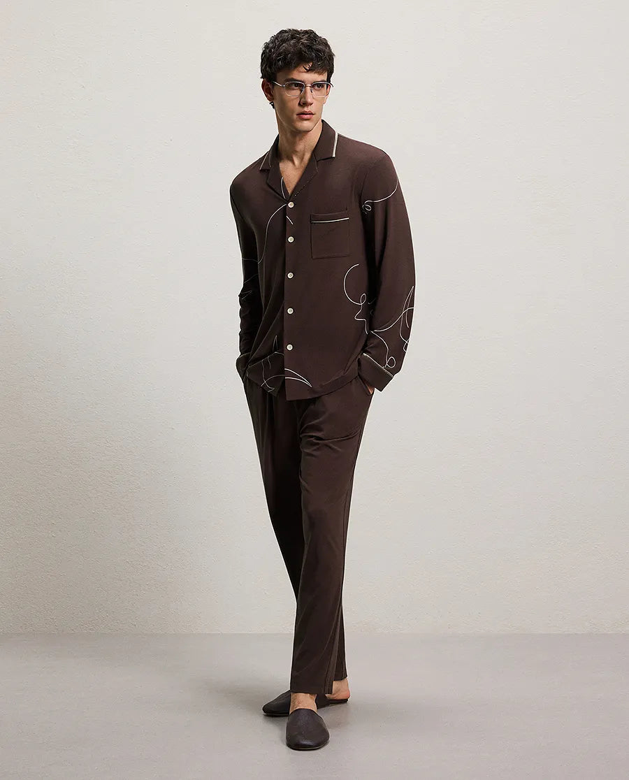 Embrace understated elegance with this refined lounge set, where comfort meets contemporary design. Inspired by the fluid movements of the ocean, the collection features an 80S milk-touch double-sided fabric that surpasses ordinary cotton in softness. The collared long-sleeve cardigan drapes with effortless sophistication, while tailored pants complete the ensemble with polished ease. Designed for those who believe luxury lies in the details, this set transforms everyday moments into occasions for refined relaxation. Experience fabric that feels as gentle as it looks, crafted for the modern man who values both style and substance.