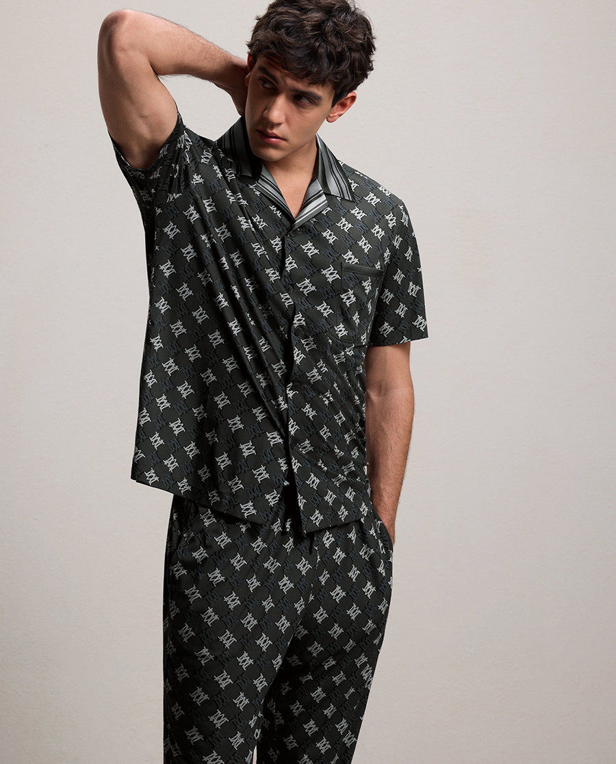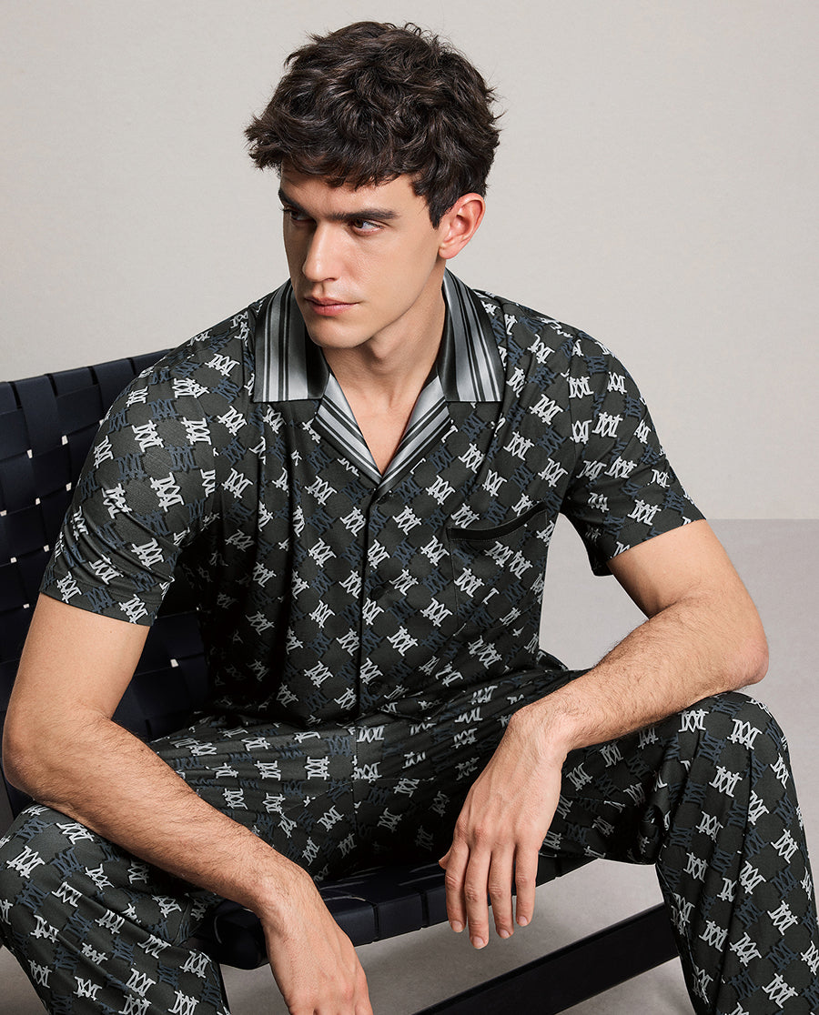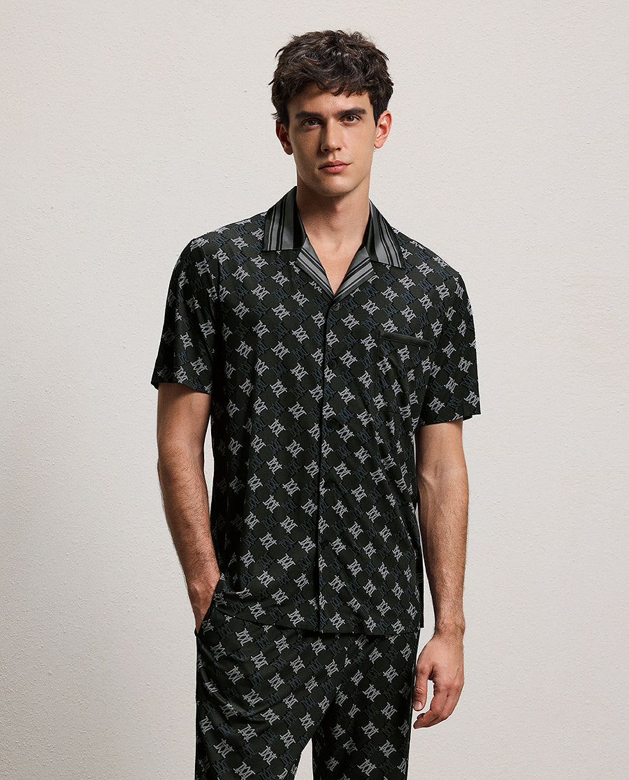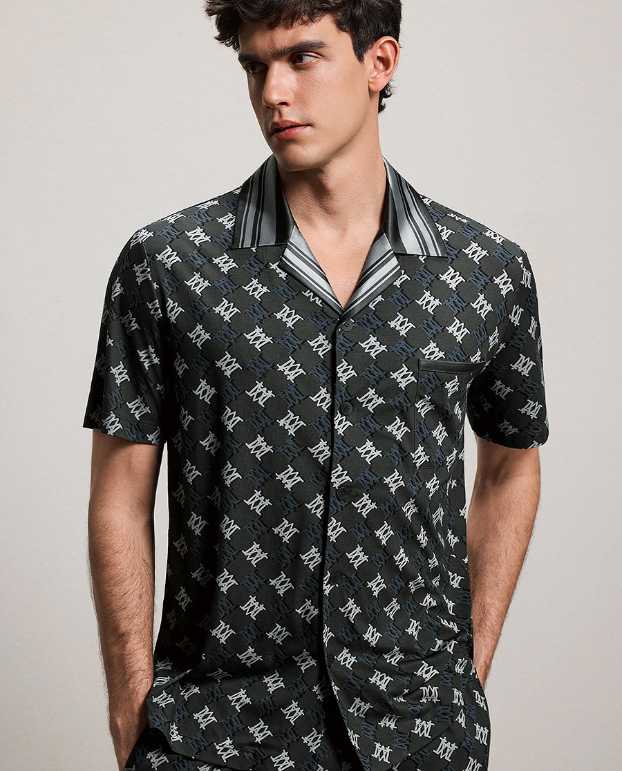 Elevate your loungewear with this refined silk cardigan, crafted from luxurious 100S silk-finished Micro Modal air fabric that delivers exceptional softness and breathability. The sophisticated monogram pattern pays homage to timeless heritage design, embodying an understated elegance synonymous with old money aesthetics. The collared silhouette and short sleeves create a polished, versatile piece perfect for relaxed luxury—ideal for layering at home or transitioning seamlessly into casual social settings. Experience the perfect balance of comfort and refined style.