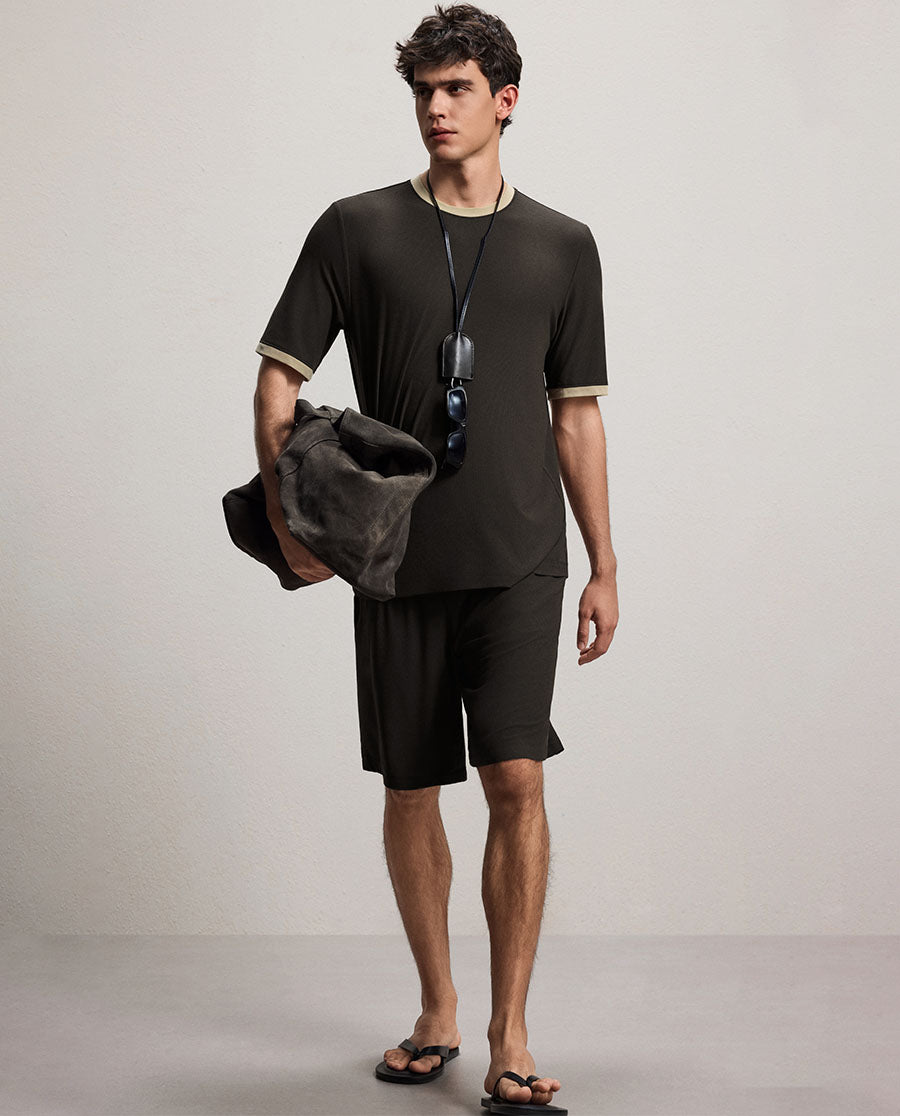 Crafted from a modal and seaweed fiber blend, this loungewear set features a soft ribbed texture designed for sensitive skin. The breathable fabric adapts seamlessly to various occasions, from relaxation at home to casual outings. Experience gentle comfort with natural fibers that prioritize skin-friendly wear without compromising on style or durability.