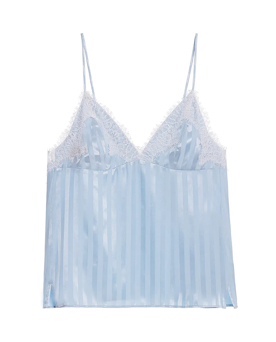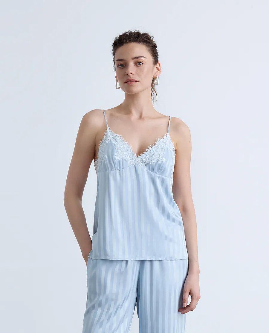 This camisole top features a unique blend of matte cotton and satin silk textures, woven in alternating stripes, which creates a slimming visual effect and enhances its lustrous appeal. Perfect for elevating your loungewear with a touch of elegance, it allows you to welcome guests confidently without needing to change outfits. Ideal for stylish sleepovers, it combines comfort and fashion effortlessly.